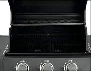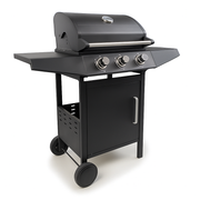Features: 3 stainless steel burners, hood thermometer, push-button ignition, fold-out side shelves, enclosed cabinet