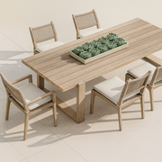 The Kestrel & Loom Ridgeway 9-Piece Teak & Woven Rope Dining Set is crafted for refined outdoor living. A long, slab-style teak table pairs with eight sculpted armchairs featuring handwoven rope backs and quick-dry cushions. With its architectural trestle base and coastal textures, this set brings resort-caliber comfort and longevity to patios, garden terraces, and pool decks.