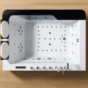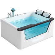 The LuminaBath DuoSpa is designed for couples seeking a luxurious and therapeutic bathing experience. This elegant whirlpool tub features a transparent side panel, dual black headrests, and a bouquet of ambient LED lights. With precision-placed jets, a handheld showerhead, and sleek chrome fixtures, the DuoSpa blends modern aesthetics with spa-grade functionality.